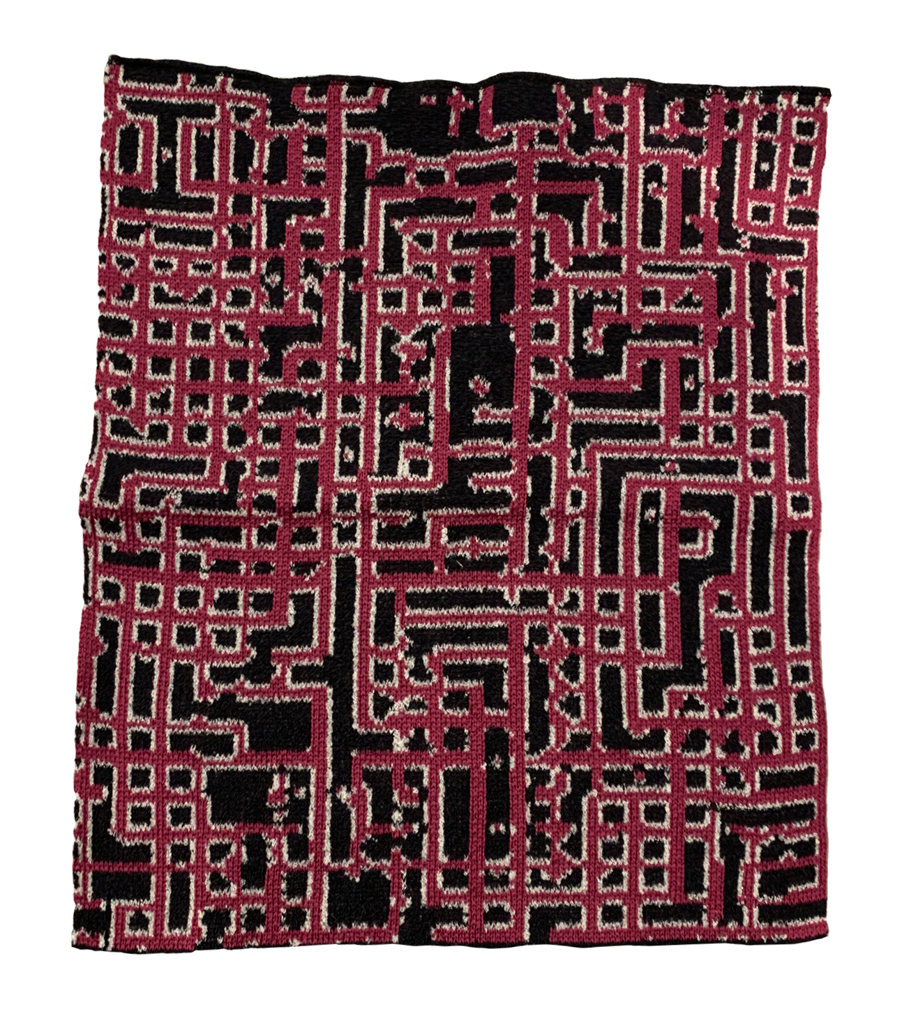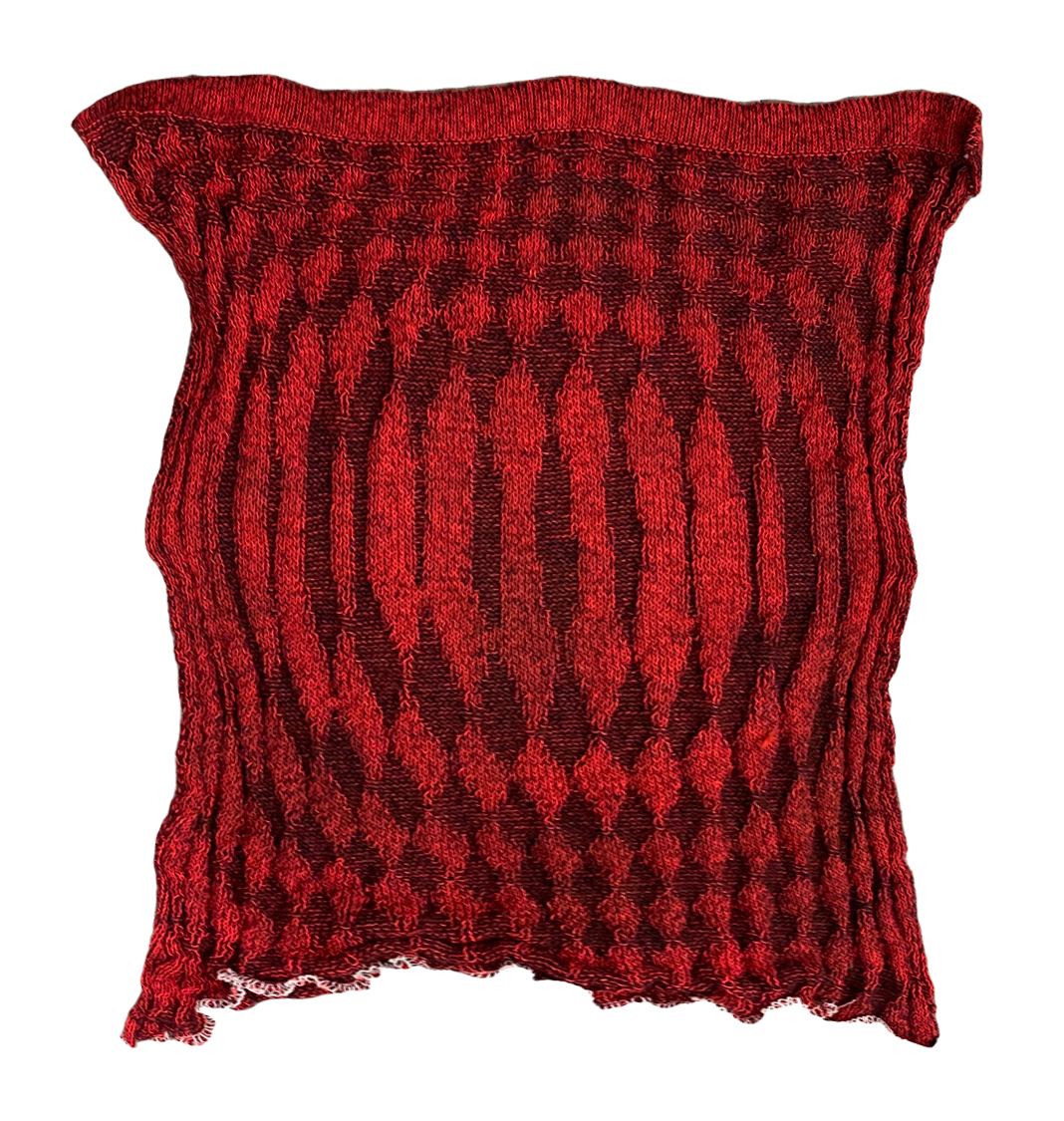 Experimental STOLL Industrail knitting samples exploring overlapping systems through color, texture, and knit structure.